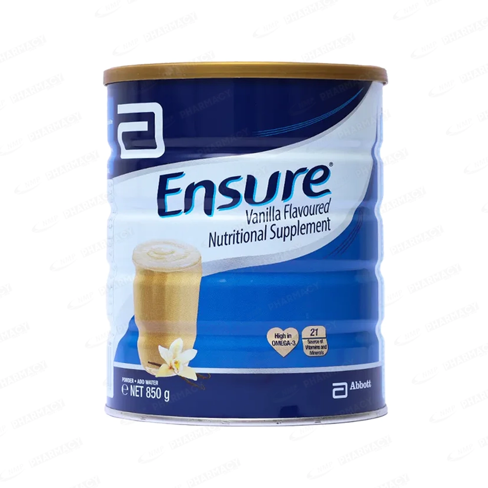 Ensure Vanilla 850gm by Abbott Dietary Supplement is typically mixed with water or milk as per the instructions on the packaging.